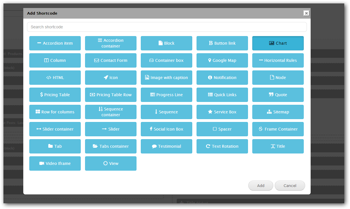 To add new shortcode click on the add shortcode icon, and will be loaded window with all allowed shortcodes. You can also type shortcode name in the search field and all not related shortcodes will disappers. Click on the required shortcode and on the "Add" button: