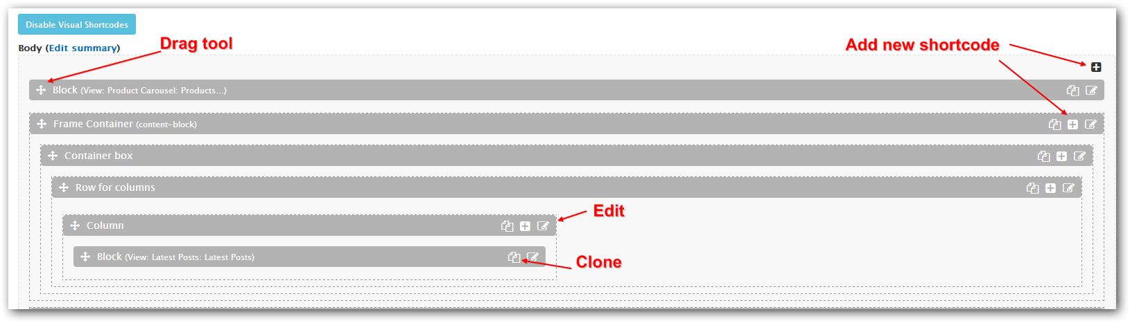 Important! You should open and save the Visual Shortcodes form at leasts ones and after this clear the Drupal cache. Before using this module open the settings page and configure it as you wish: admin/config/content/nd_visualshortcodes. The default settings is Enable for next Text Formats: shortcode_dynamic, Default HTML tag Format: full_html