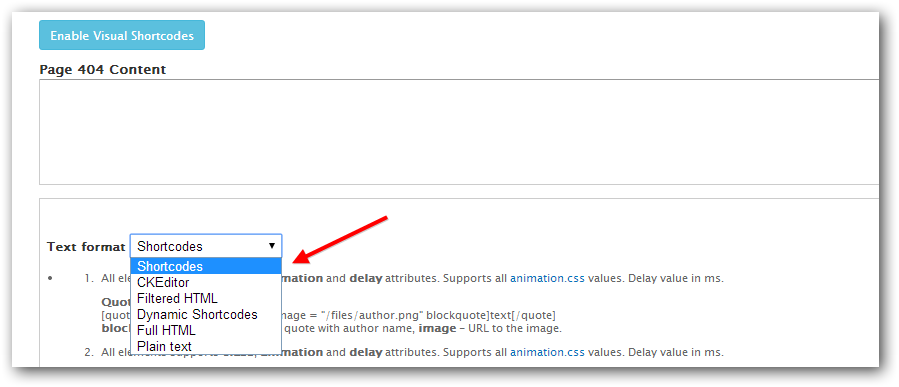 Important! You should open and save the Visual Shortcodes form at leasts ones and after this clear the Drupal cache. Before using this module open the settings page and configure it as you wish: admin/config/content/nd_visualshortcodes. The default settings is Enable for next Text Formats: shortcode_dynamic, Default HTML tag Format: full_html